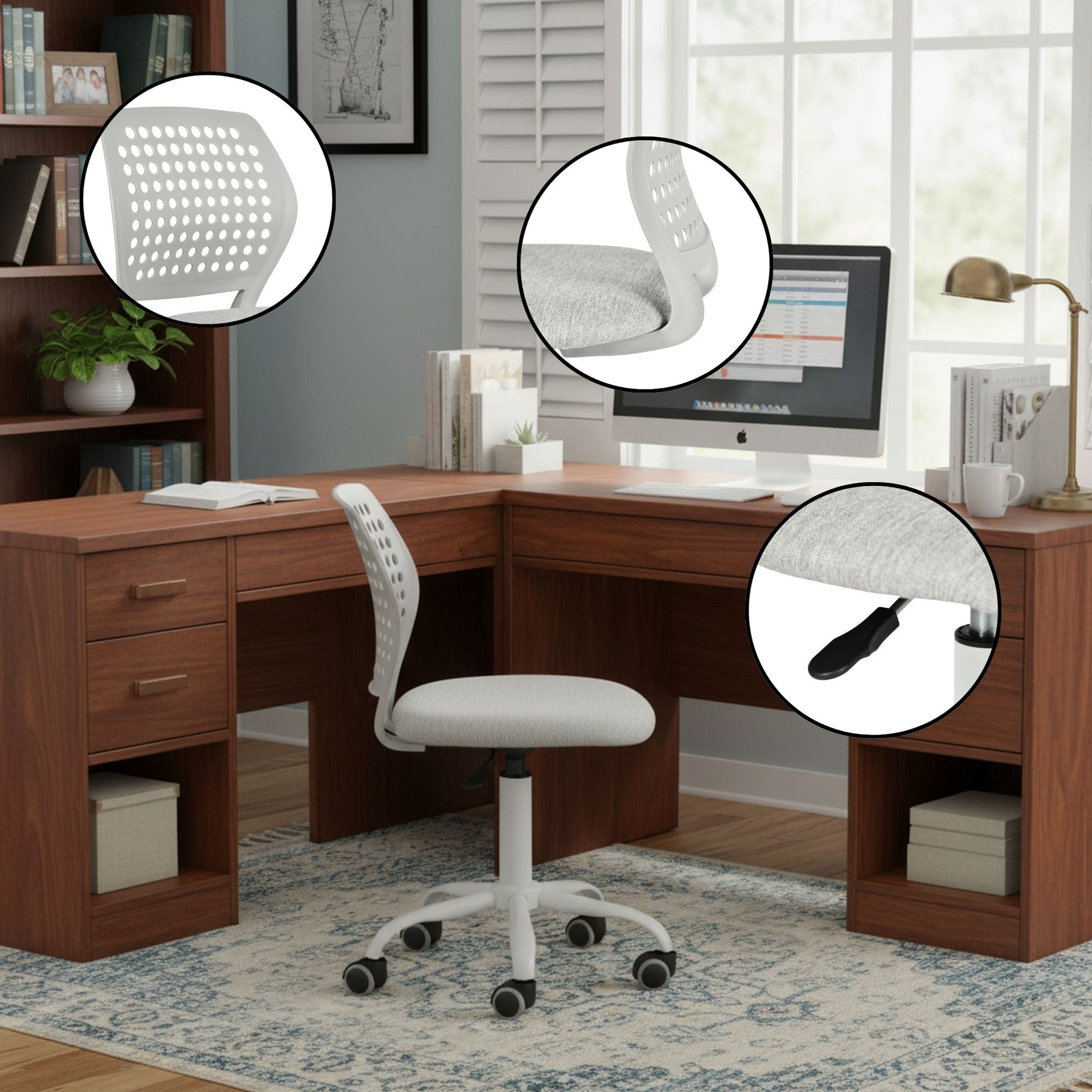 Voici une chaise de bureau réglable avec un dossier et une assise perforés gris menthe. Réglable en hauteur, elle offre une hauteur totale ajustable de 75 cm à 85 cm et une hauteur d'assise réglable de 44 cm à 54 cm. Compacte, elle mesure 45,5 cm de large, le dossier 31,5 cm de large et l'assise 39 cm de large et 38 cm de profondeur. Équipée de roulettes, elle se déplace facilement et convient parfaitement aux bureaux à domicile ou aux espaces de travail, offrant confort et flexibilité d'utilisation.